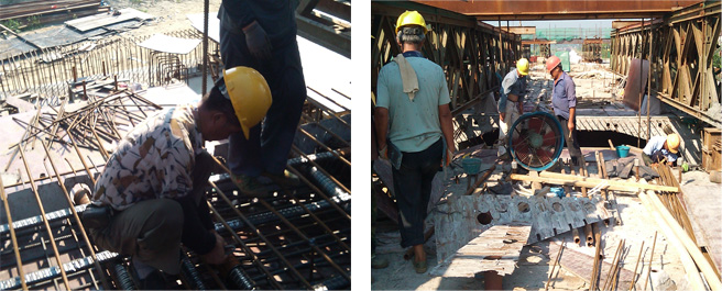 而各项工序的如期完工更离不开施工一线的普通路桥建设者。记得前几天下雨,他们依然在桥上绑扎钢筋,立模板,雨实在太大了,他们就躲在桥下休息会等雨小了点再继续工作,为的就是能完成节点目标,从而保证最终工期。今天早上张拉竖向筋,一大早气温就有三十几度了,四五个工人抬着油顶,汗顺着脸颊留下来,衣服都湿透了,汗水顺着衣角流下来。然而工作未完成谁都不肯休息,黝黑的脸上一笑就看到白白的牙齿。这就是我们可爱的工人,即使再苦再累他们也要把活干好,也要实现工期指标。当然项目部人员也没闲着,给工人进行高温施工的安全培训,合理安排作息时间,进行错时作业,避免高温施工;进行演练,并且做好防高温后勤保障工作,备齐充足的饮用水、绿豆汤,为施工人员发放防暑降温物品和药品,尽量为施工人员提供良好的休息环境。
