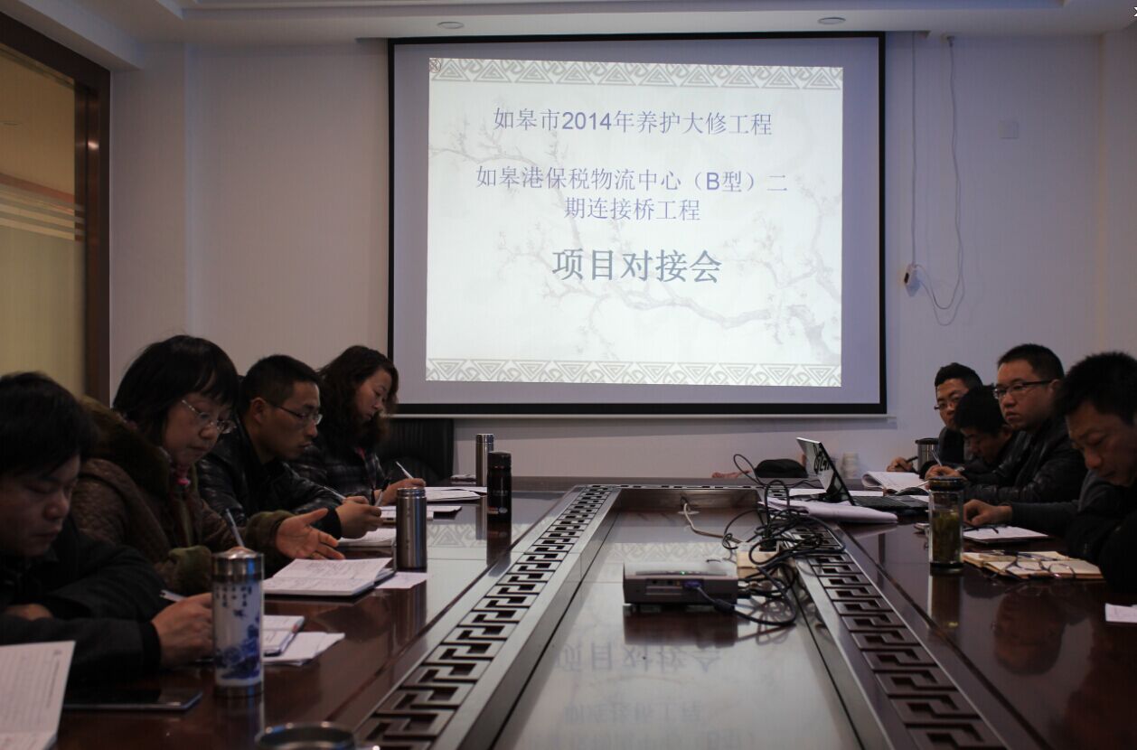 2015年3月28日下午5:00时,公司在本部二楼会议室召开了首批新开工项目对接会。会议由公司副总经理兼总工程师王兵主持,公司经营层领导、各部门主管、新开工项目管理团队成员共18人与会。 会上,业务开发部部长成志军首先介绍了如皋市2014年养护大修工程、如皋港保税物流中心(B型)二期连接桥工程项目的情况、主要工程量、工期、项目部人员组成、公司管理模式;接着,各部门分别对项目管理提出了要求,项目部提出了一些需要协调解决的问题,王总就项目部与部门资源对接、对项目部千分制考核办法等进行了说明。