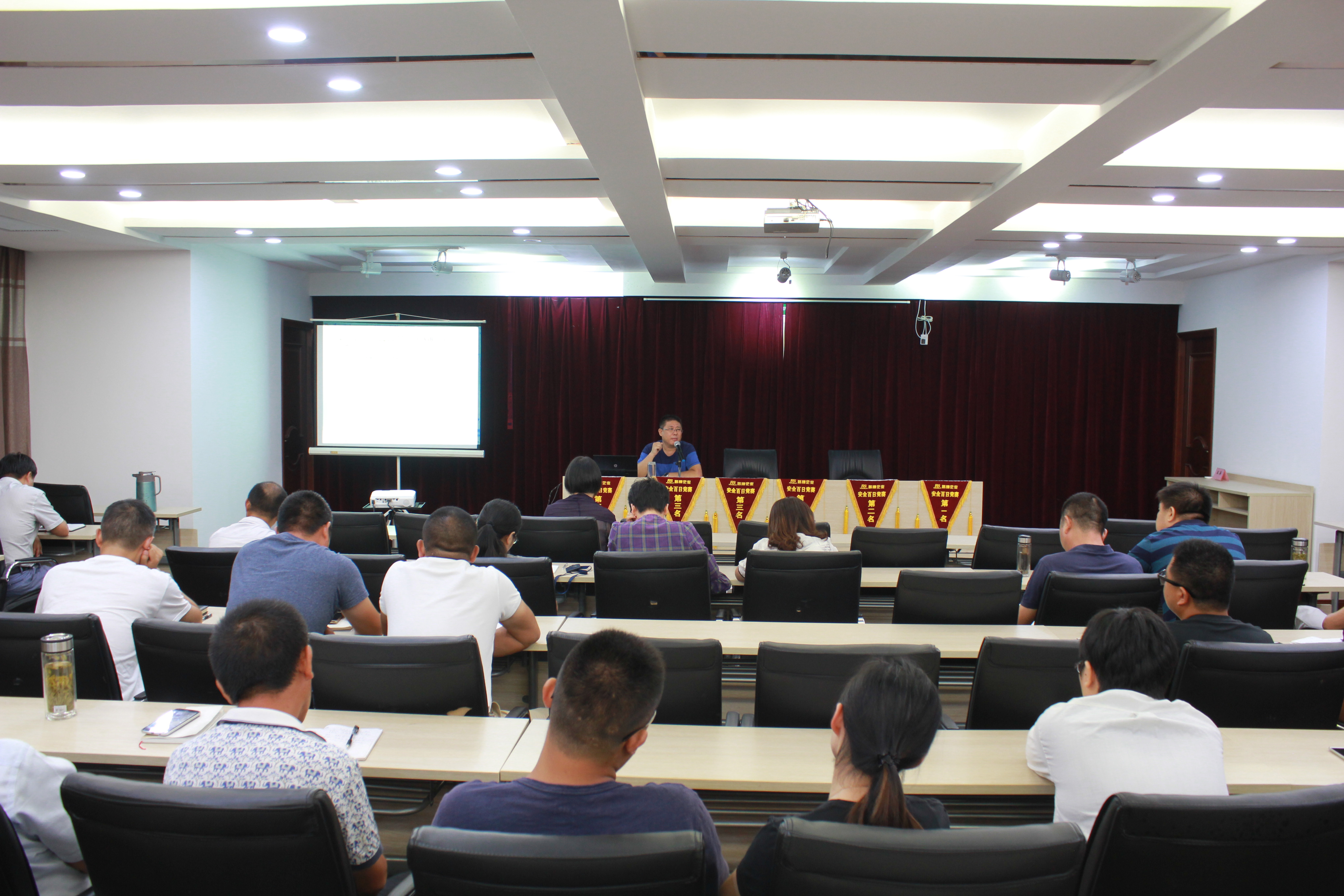 8月15日下午5:00时,7月份考核通报会在公司二楼大会议室召开,公司经营层、中层管理人员、部门人员、分公司管理组人员、各作业队组长、副组长等近40人与会。 |