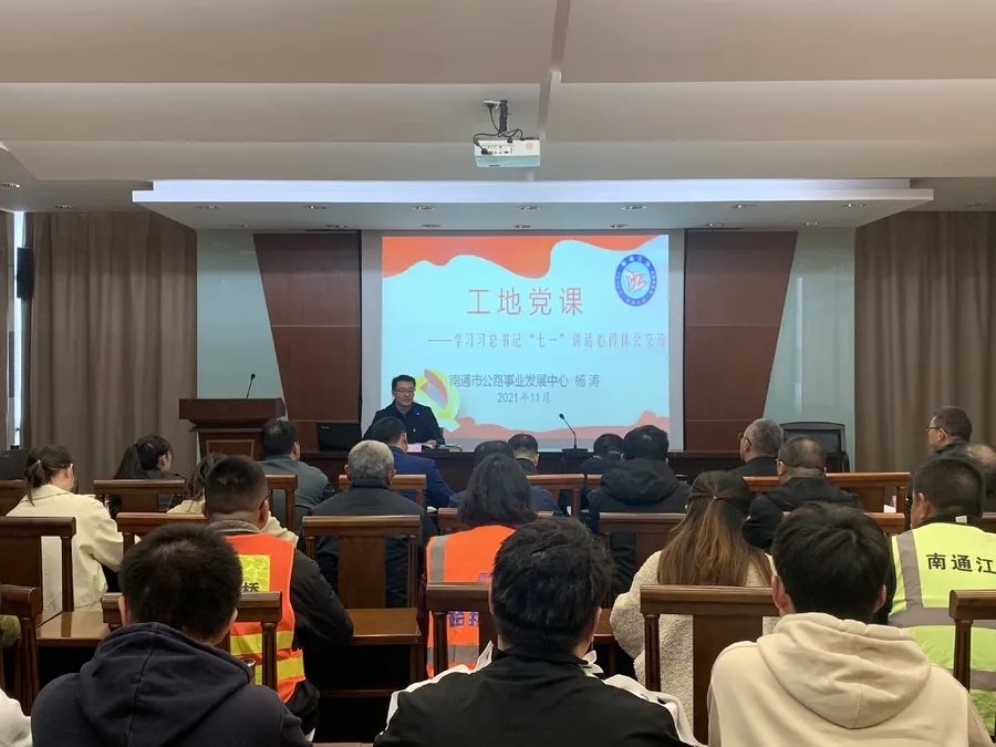 讲初心,说感受,抓落实,在学习教育中提升使命和担当意识。各标段党小组利用项目部闲暇时间组织工地党员学习党史,筑牢思想根基。海门标段党小组与兴达公路养护公司、海萌交通建设工程有限公司开展党建共建活动,举行技能比武测试,签订工程廉政承诺;通州标段党小组发出红色动员,送法进工地的同时以一堂“以史为鉴,坚守初心使命”的微型党课巩固了团队的凝聚力和战斗力,号召工地党员以精益求精的工匠精神铸造品质工程。